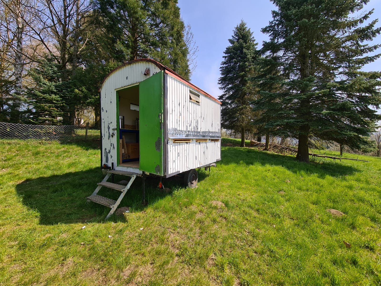 Mittlerweile bin ich mit meinen drei Völkern in einen „Bienenwagen“ umgezogen. Ich habe einen alten Bauwagen gekauft und ihn entsprechend umgebaut.